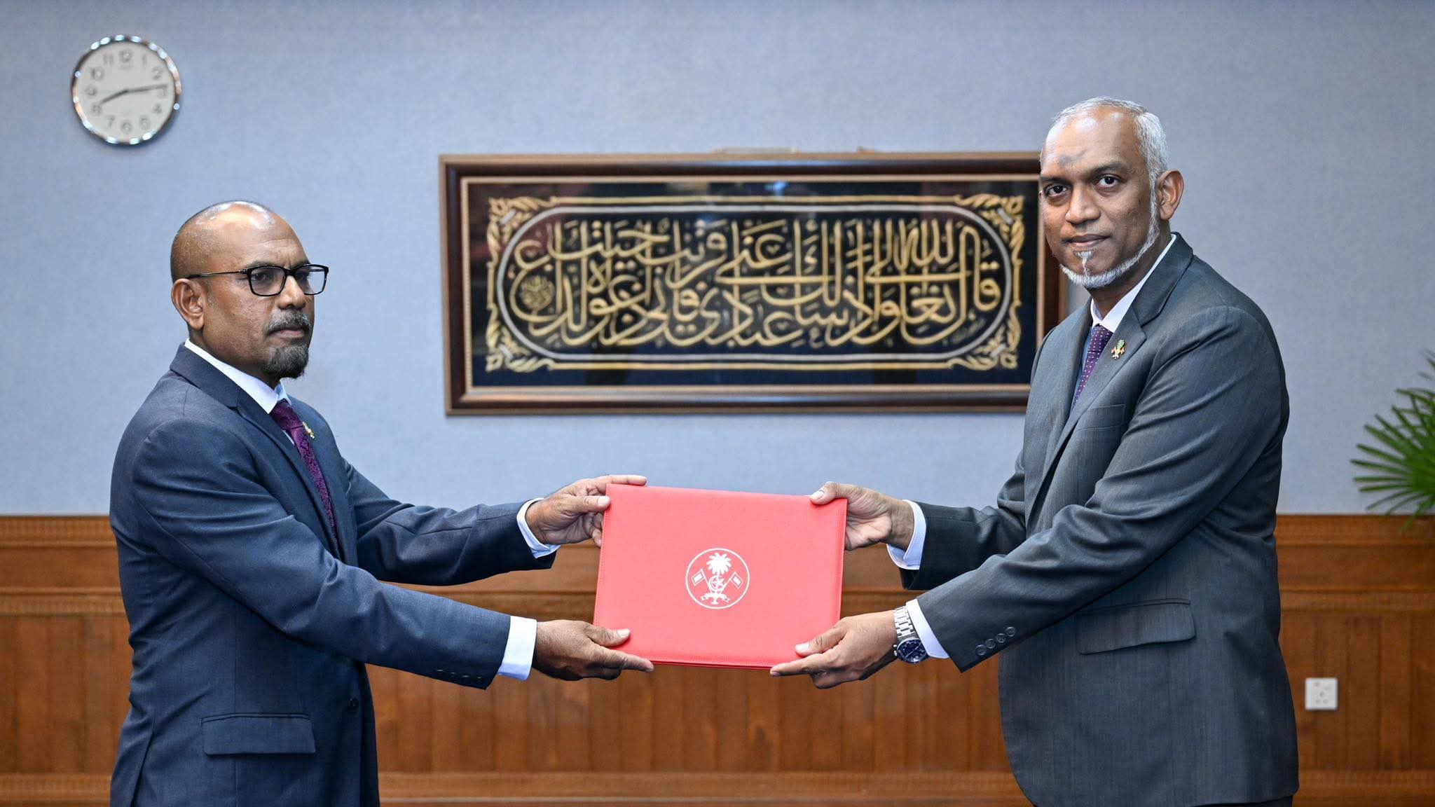 ވަޒީރަށް މަޤާމުގެ ފަތްކޮޅު ދެއްވުމަށް ބޭއްވެވި ރަސްމިއްޔާތު އޮތީ މިރޭ އިރާކޮޅުގެ ވަގުތެއްގައި، ރައީސުލްޖުމްހޫރިއްޔާގެ އޮފީހުގަ އެވެ.